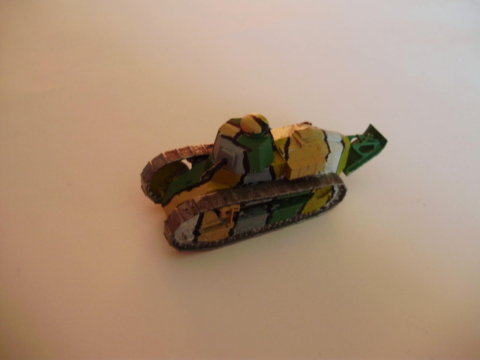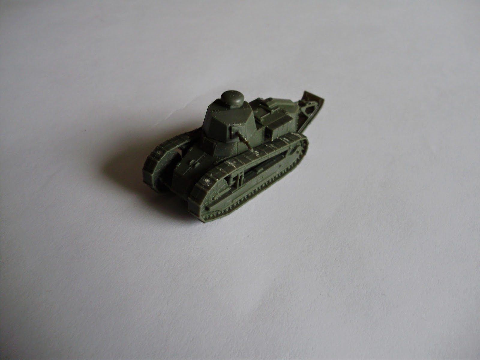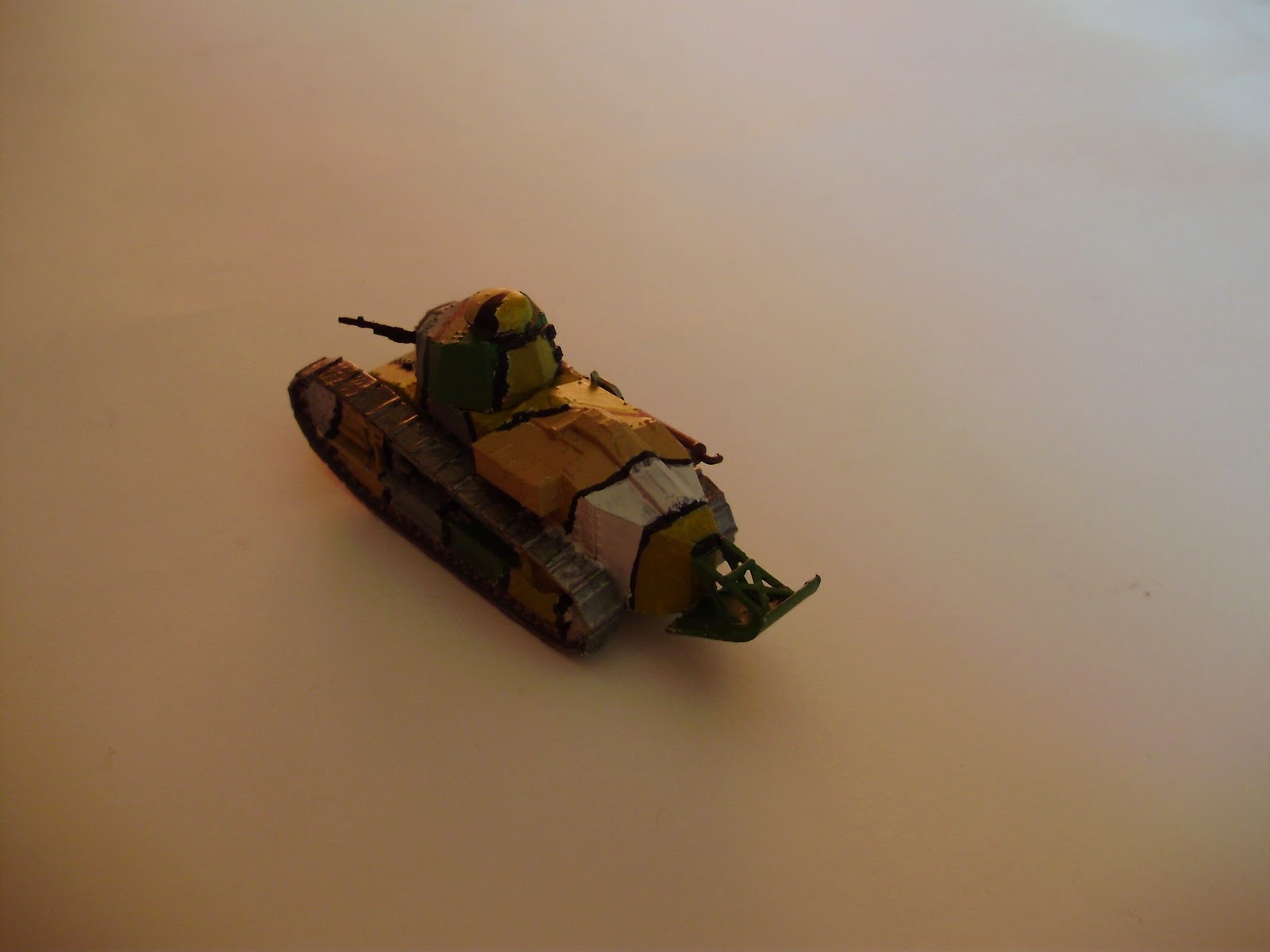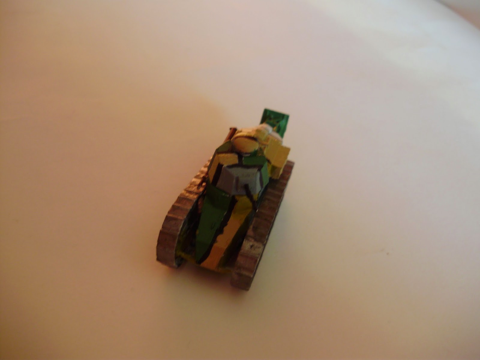 Tak wygląda po sklejeniu. Gąsienice trzeba jeszcze przelifować. Poniżej zdjęcia gotowego modelu. Użyłem schematu malowania "japońskiego", jak go nazywano w Polsce. Niestety popełniłem dwa błędy. To malowanie występowali w okrągłej wieży, a tutaj jest wielokątowa. No i czarne linie wyszły trochę za grube. Dziś namalowałbym je jakimś czarnym cienkopisem.