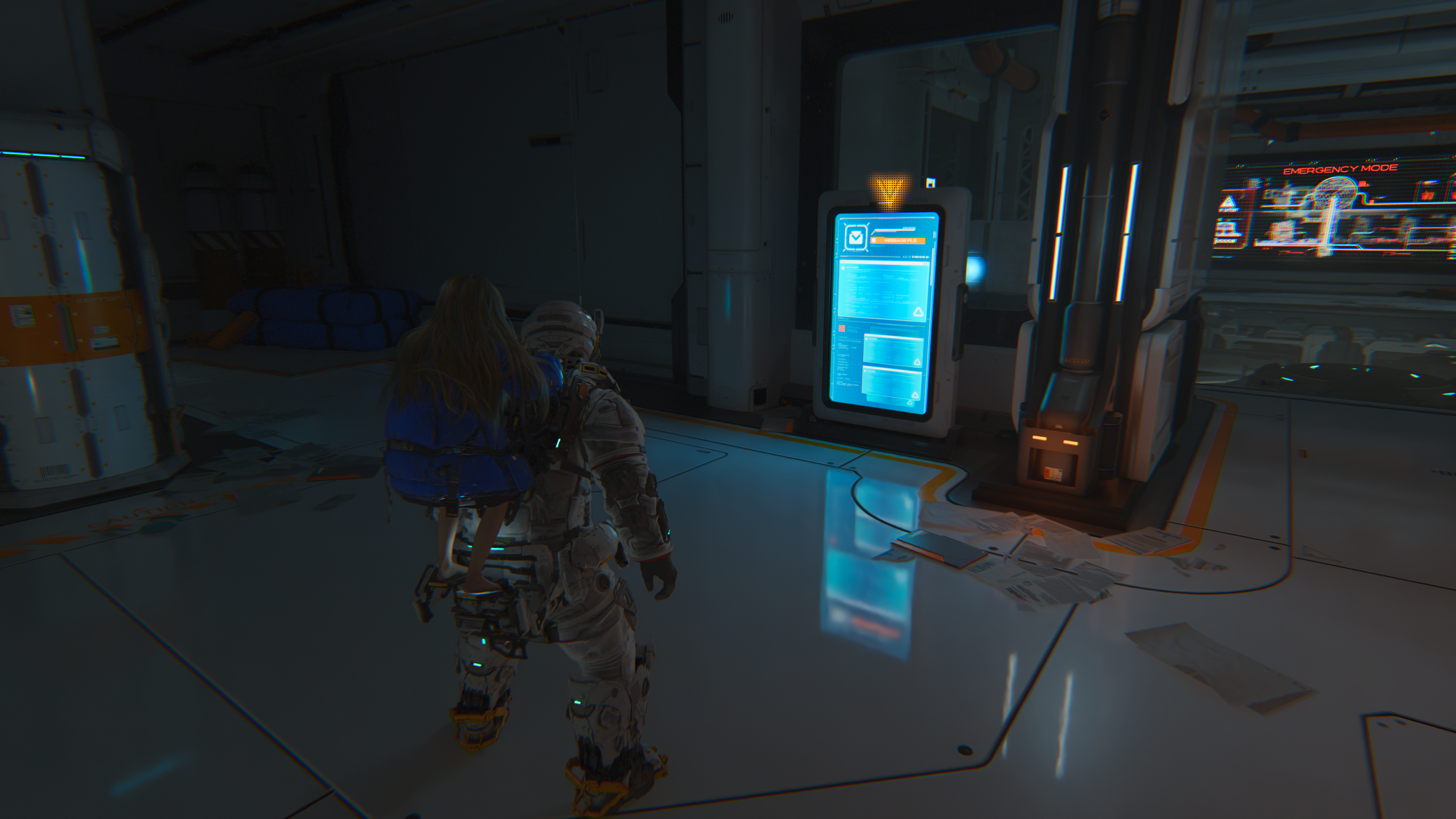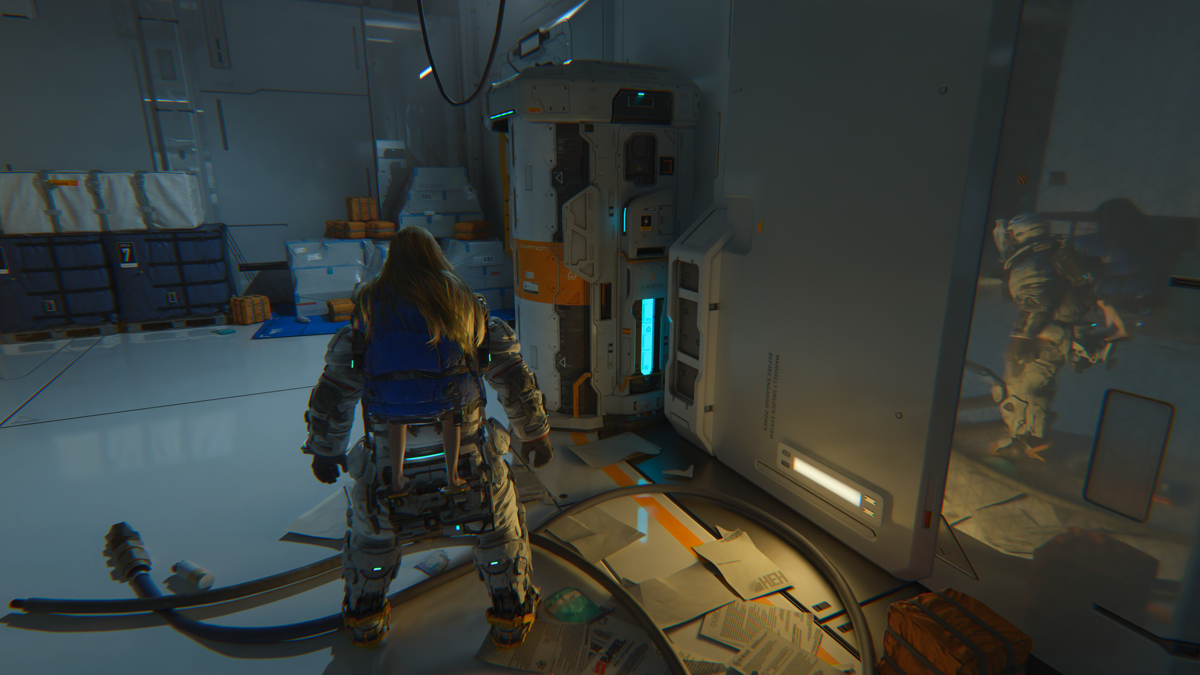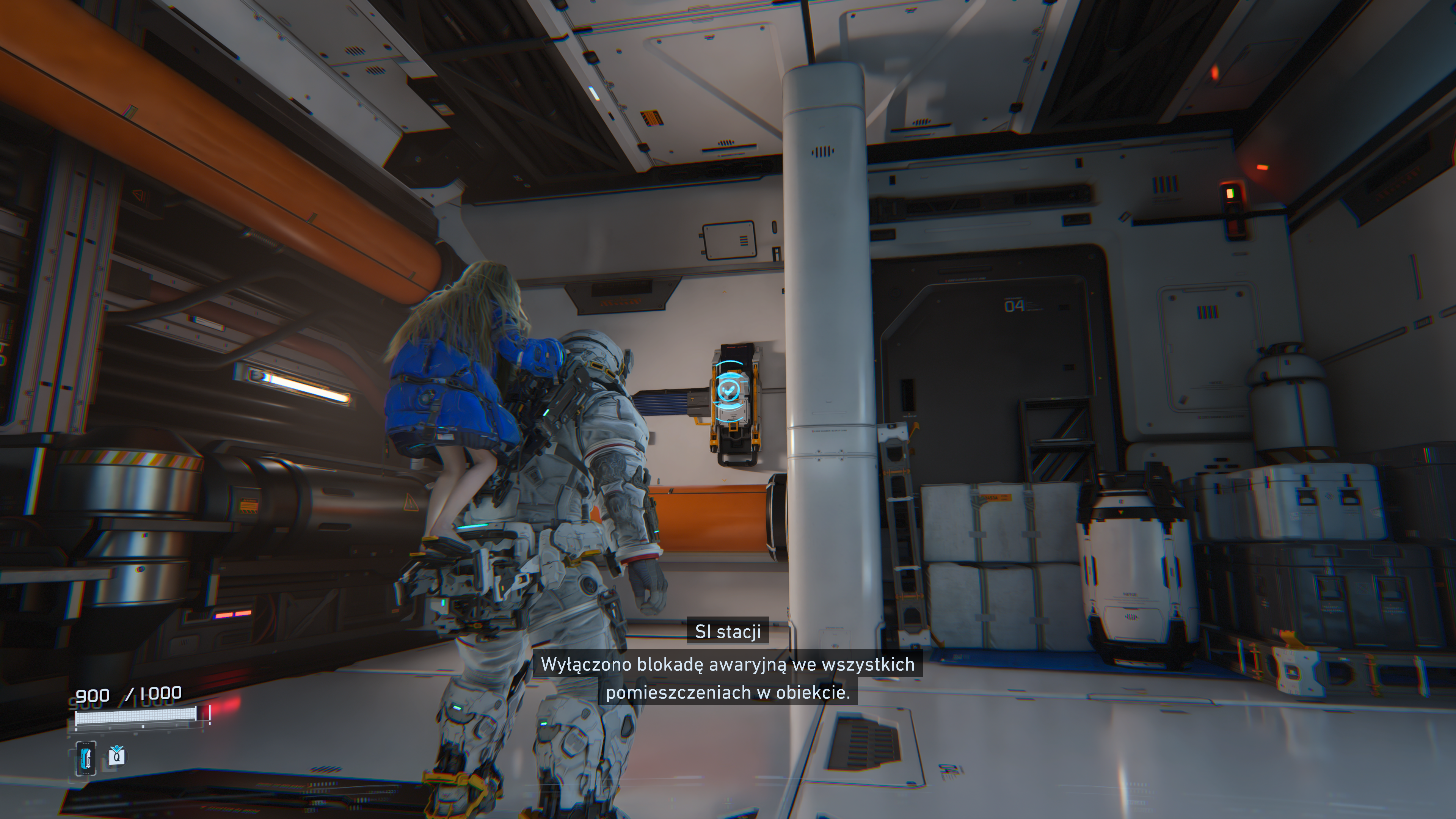 Niestety, implementacja w pełni śledzonych ścieżek świetlnych obnaża specyficzne braki w autorskim potoku renderowania fizycznego. Zastosowanie Path Tracingu wywołuje w Pragmacie zjawisko, które w branżowym żargonie określane jest mianem RTX mirror spam. Chodzi o to, że materiały o niższej chropowatości tracą swoje właściwe albedo na rzecz nienaturalnie ostrego wypolerowania. Powierzchnie stają się wręcz sterylnie błyszczące, co sprawia, że rzekomo zrujnowana, księżycowa placówka badawcza odbija światło niczym posadzka w luksusowym salonie samochodowym. Widać to doskonale na polimerowych skafandrach oraz metalicznych elementach otoczenia, gdzie algorytmy obliczające wielokrotne odbicia wtórne nadinterpretują właściwości fizyczne materiałów, serwując nam agresywny, wizualny przepych kosztem artystycznego realizmu. Oczywiście, to wygląda bardzo efektownie, niemniej rozumiem komentarze niektórych osób narzekających, że wszystko się nienaturalnie świeci. Dla mnie jednak efekt jest świetny, bo robi duże wrażenie techniczne, a przy tym przywodzi na myśl prawdziwe sci-fi.
